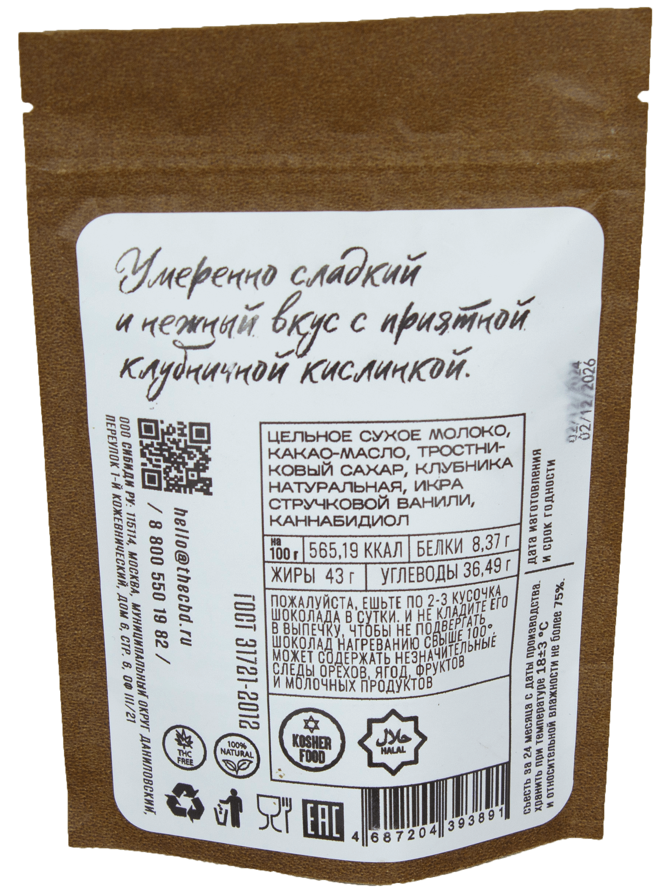 Цельное сухое молоко, какао-масло, тростниковый сахар, клубника натуральная, икра стручковой ванили, каннабидиол.