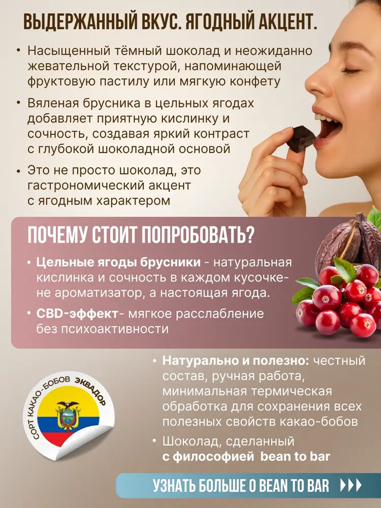 Шоколад с необычной текстурой, напоминающий жевательную конфету. Сочность и насыщенность шоколаду придают цельные ягоды брусники.