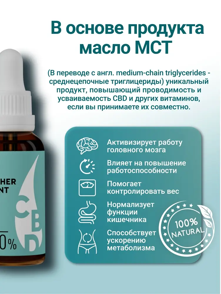 Маслом-основой является МСТ-масло (от англ. medium-chain triglycerides - среднецепочные триглицериды) — уникальный продукт, повышающий проводимость и усваиваемость CBD и других витаминов, если вы принимаете их параллельно.
