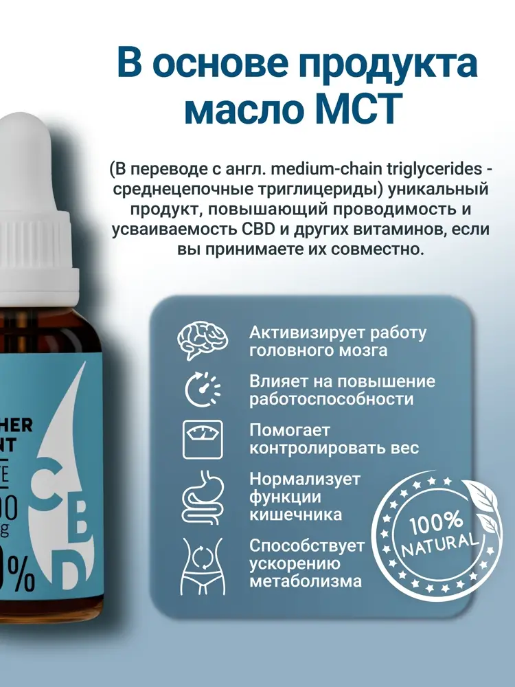 Маслом-основой является МСТ-масло (от англ. medium-chain triglycerides - среднецепочные триглицериды) — уникальный продукт, повышающий проводимость и усваиваемость CBD и других витаминов, если вы принимаете их параллельно.